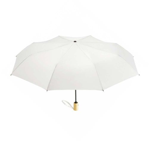 Bæredygtig automatisk open/luk mini-paraply fremstillet af genanvendt plast. Paraplyen har et håndtag i bambus, som giver et naturligt og bæredygtigt udtryk. Hver paraply er forsynet med en etiket, der angiver, hvilke materialer paraplyen er fremstillet af.