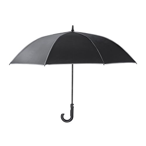 Denne vindbestandige paraply er lavet af stærkt RPET-pongee, fremstillet af genanvendte PET-flasker. Med sit elegante sorte design og reflekterende detaljer bliver du set – selv i en mørk regnbyge. Paraplyen åbner automatisk, har en diameter på 120 cm (27") og er udstyret med stærke glasfiberribber og et PP-håndtag. Den er nem at tage med takket være det medfølgende etui med justerbar rem og velcrolukning.