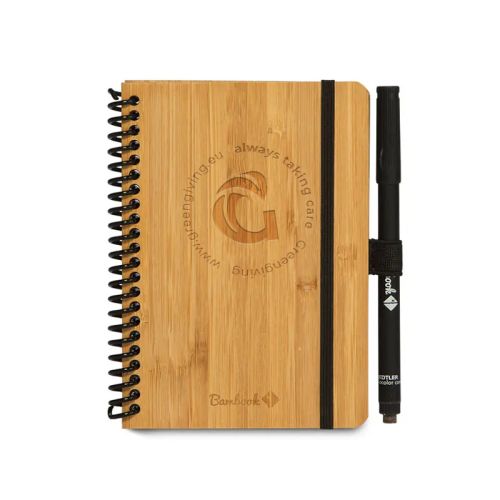 Denne hardcover Bambook har A5-format, er lavet af massiv bambus og er forsynet med elastik. På forsiden af hardcoveren kan du få graveret dit virksomhedslogo eller endda personlige navne. Bambook har 20 ark (40 sider). Til tryk på disse sider kan du vælge mellem 7 muligheder. Hvis du selv ønsker at sammensætte indholdet, har du 4 muligheder. Ekstrapris for denne mulighed er €1,- per notesbog.