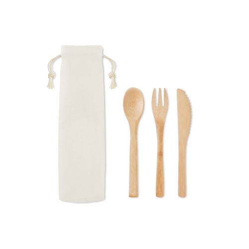 Skal du have mad med på farten fra fx et to go-supermarked? Så er det praktisk at have dit eget bestik med, så du undgår at bruge plastik. Dette bambus bestiksæt er genanvendeligt og leveres i en flot opbevaringspose af bomuld. Sættet består af en kniv, gaffel og ske i bambus. Denne naturlige græstype vokser hurtigt og kan derfor produceres nemt og effektivt.