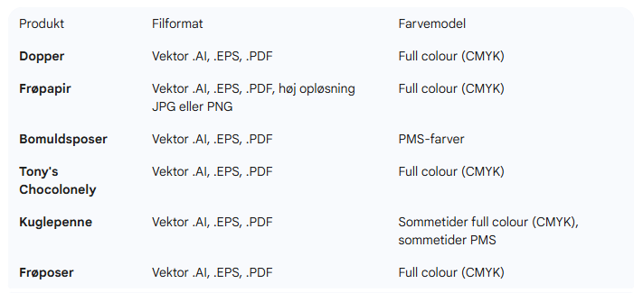 Vi har samlet per produkt, hvordan du skal aflevere din fil: