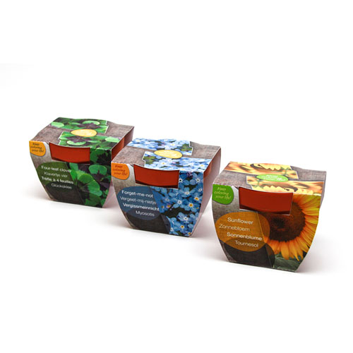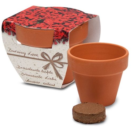 En lille terrakottakrukke med en plante er altid et sikkert hit hos dine kunder og/eller relationer. I krukken findes en tørvetablet og blomsterfrø. Du kan vælge mellem frø af forglemmigej, margueritter, solsikker, firkløver og brændende kærlighed. Når frøene sås, skal de holdes godt fugtige, så de kan spire. Terrakottakrukken kan trykkes med dit logo, hvilket gør dette til en meget bæredygtig måde at reklamere på. Et blomstrende og voksende produkt som firmagave – hvem ønsker ikke det?