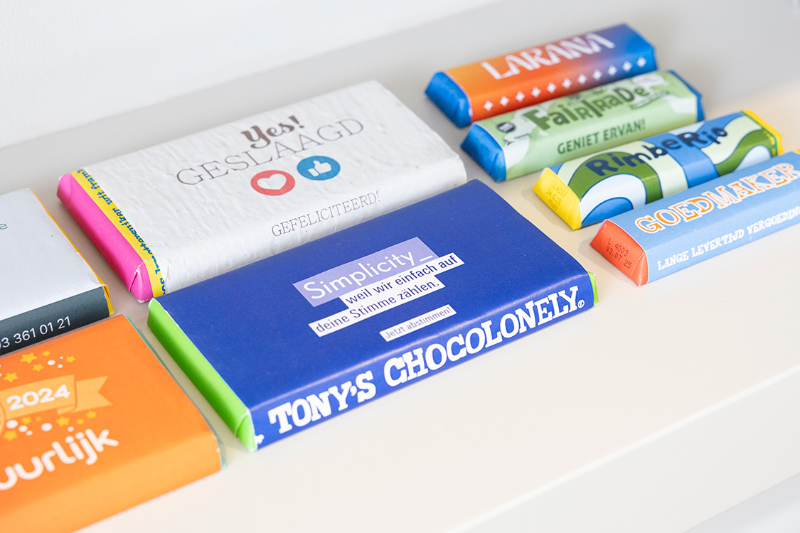 Mange mennesker elsker chokolade. Ikke underligt, at chokolade er populært som firmagave eller giveaway. Hos os kan du personalisere chokoladegaver med en indpakning eller sticker. Al chokolade er produceret på en fair måde, hvilket fremgår af mærkninger som Fairtrade og UTZ. Overrask dine medarbejdere eller samarbejdspartnere med en trykt chokoladegave!