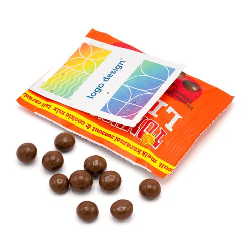 Har du noget mindre i tankerne? Så er chokolade med sticker et smart valg. Tænk på Tiny Tony’s med et logo eller tekst på en sticker. Praktisk at dele ud på events eller inkludere i mailings. Lille gestus, stor effekt.