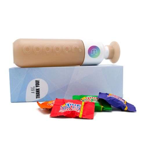 Dopper Insulated i en flot æske: den perfekte gave til at overraske medarbejdere eller relationer med ved årets afslutning. Termoflasken har et stilrent og moderne design og holder drikkevarer varme i op til 9 timer. Med hver flaske sparer du samtidig en stor mængde engangsplastik. Insulated er fyldt med lækre Tiny Tony chokolader.