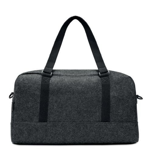 Uanset om det er til en storbytur, sport eller fritid, er denne weekendtaske i filt altid praktisk! Tasken er udstyret med en forlomme med lynlas, canvas handtag og en aftagelig justerbar skulderrem. Den er fremstillet af filt lavet af genanvendte PET-flasker. Dette fremgar ogsa af labelen pa siden af tasken.