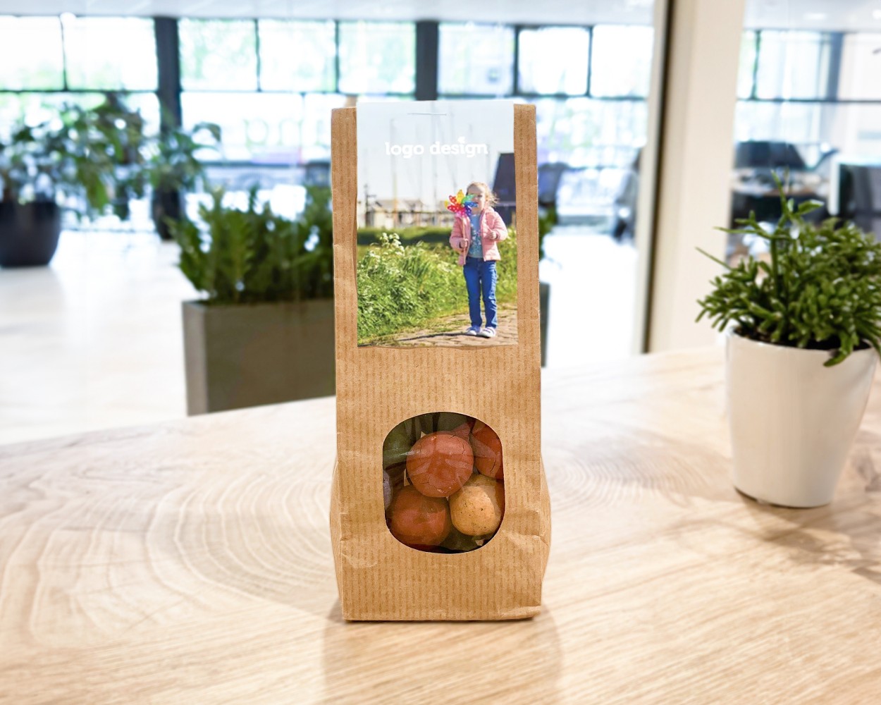 Alle frøbombe-gaver kan trykkes med dit logo eller design. På produktsiden fremgår det, hvor mange farver og hvilke placeringer der er mulige. Med en trykt æske med frøbomber kan du på en grøn og original måde promovere dit firma eller organisation. Det er samtidig den perfekte måde at forvandle en have, grøft eller altan til en farverig blomstereng.