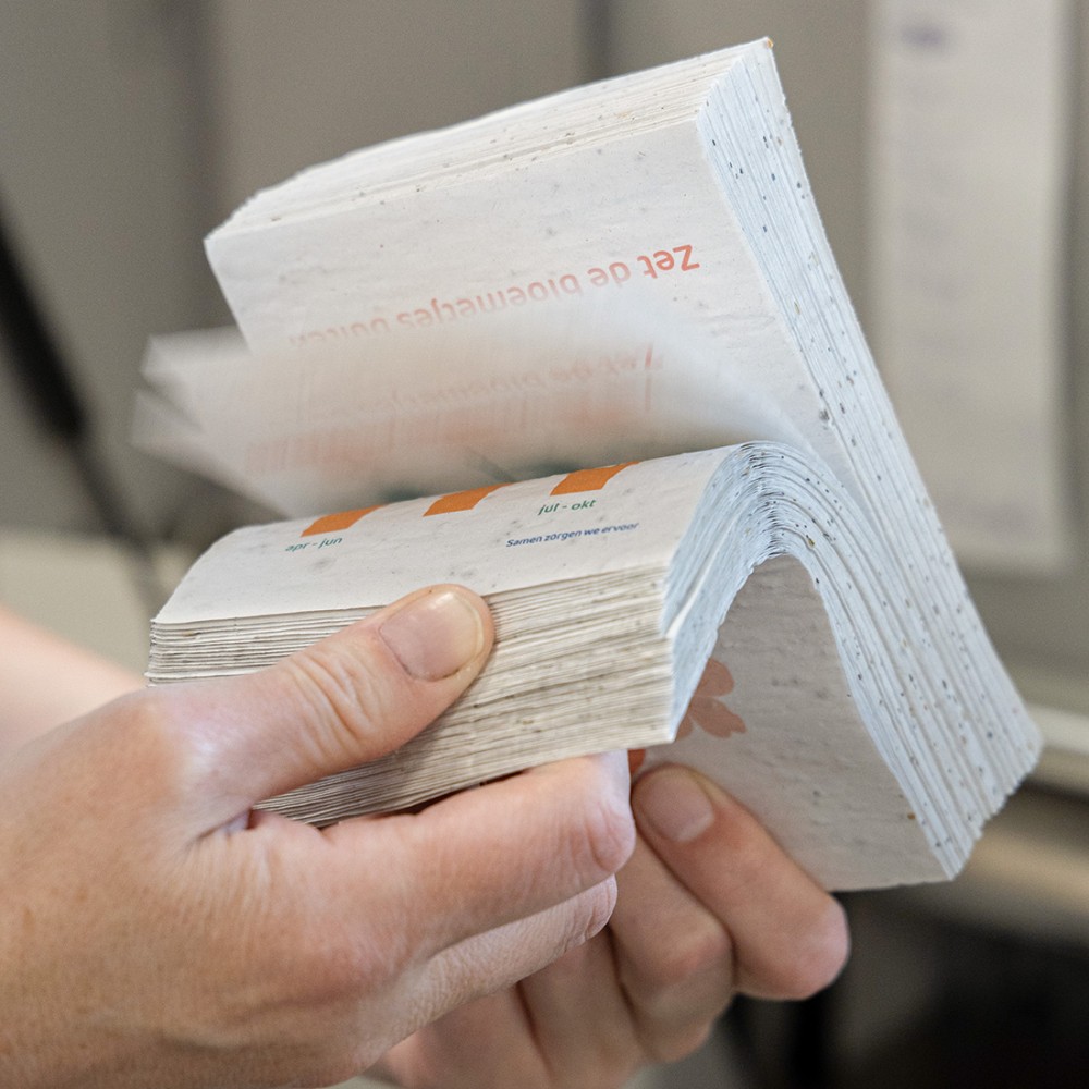 A5- og A6-kort af frøpapir er særligt populære. De gør det muligt at formidle dit budskab på en original og grøn måde. Frøpapirkort kan bruges til utallige kampagner og aktiviteter. Ud over de klassiske kort leder vi hele tiden efter nye, kreative anvendelser af frøpapir. Hvad med f.eks. denne bordkalender eller en taske af frøpapir? Kort sagt: mulighederne med dette bæredygtige frøpapir er uendelige. Har du selv en god idé? Så hører vi meget gerne fra dig!