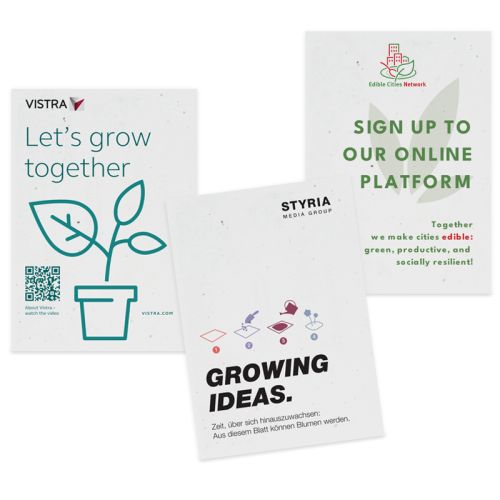 Navnet siger det hele: papir, der gror. Frøpapir består af to tynde lag papir med frø imellem. Efter brug plantes det i jorden, og efter noget tid spirer der smukke blomster frem. Frøpapiret kan trykkes med dit eget design. Det er også muligt at bestille ubedrukt frøpapir (allerede fra 25 eller 50 stk.). Frøpapir med tryk er originalt, bæredygtigt og personligt – og derfor perfekt som markedsføringsmiddel.