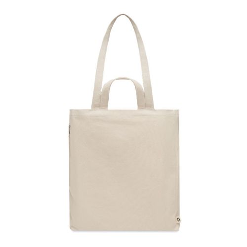 En mulepose er altid praktisk, især denne version med både korte og lange hanke. Den har også en smart sidelomme med lynlås og en stabil bundkile. Tasken er fremstillet af genanvendt bomuld (70%) og genanvendt polyester (30%). Du kan få tasken trykt på både for- og bagside i 1-4 farver.