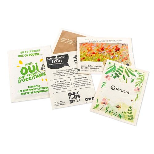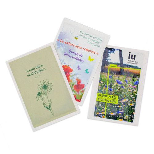 Under kategorien grønne firmagaver tilbyder vi de smukkeste produkter. Vælg blomstrende giveaways som frøbomber eller frøposer. Frøposer er perfekte som ekstra vedlæg til et brev eller gavepakke – eller som mailing. Også kort af frøpapir er meget populære. Det er papir med frø af blomster eller krydderurter indeni. På frøpapiret kan du få trykt dit eget design. Når det senere plantes i jorden, efterlades et smukt og levende resultat af dit budskab: et hav af blomster!