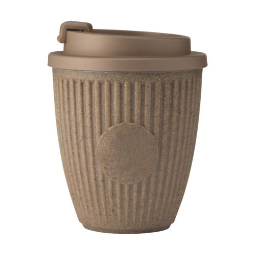 Dette to go kaffekrus har et særligt udseende. Det er nemlig lavet af kaffegrums og affald fra sukkerrør, hvilket ses i designet. Indervæggen og låget er lavet af et komposterbart PLA-materiale. Låget har en kliklås for at forhindre uønsket lækage. Kruset rummer 250 ml, ideelt til at holde kaffe eller te varm på farten. Kruset kan trykkes på forsiden i 1-5 farver. En super sjov måde at reklamere på!