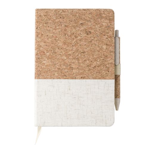 Denne notesbog er super stilfuld takket være de anvendte materialer. Den øverste del af coveret er lavet af kork, mens den nederste del er af lærred. Også pennen er fremstillet af naturlige materialer, nemlig kork og hvedehalm. Notesbogen indeholder 80 linjerede sider med datofelter. Kuglepennen skriver med blå blæk.
