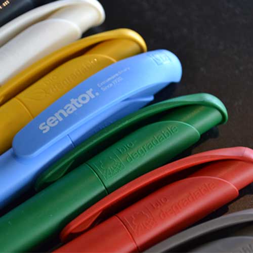 De miljøvenlige kuglepenne i vores sortiment er fremstillet af biologisk nedbrydelige eller genanvendelige materialer som majsstivelse, pap, træ eller genbrugsemballage. Alle kuglepenne kan naturligvis trykkes med dit logo eller slogan – ofte i flere farver og på flere placeringer. Du kan også vælge kuglepenne med fuldfarvet tryk. Ved visse træ- eller bambusmodeller er gravering mulig, hvilket giver et ekstra eksklusivt udtryk. Vælger du luksus kuglepenne med tryk eller foretrækker du billige kuglepenne med tryk?