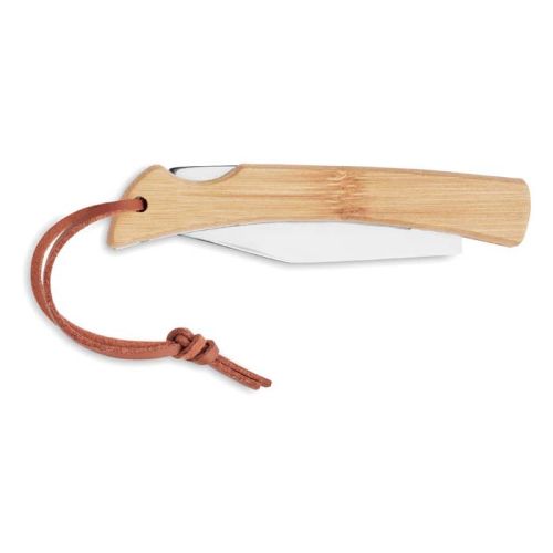 En velfungerende lommekniv er uundværlig på ferier og ture. Derfor er denne foldbare kniv ideel som en praktisk og stilfuld firmagave. Kniven er fremstillet af rustfrit stål og har et håndtag af bambus samt en ophængssnor af PU-læder. Du kan få lommekniven indgraveret med dit logo eller tekst. Med en gave som denne gør du helt sikkert indtryk!