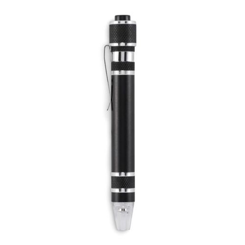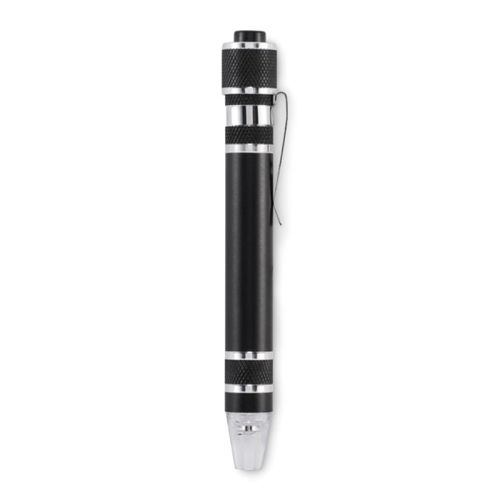 Med dette praktiske multiværktøj i penform har du både lommelygte og skruetrækker i én. Takket være det kompakte format og den lave vægt kan du nemt tage den med dig. Multiværktøjet er fremstillet af genanvendt aluminium og leveres med 3 fladskruetrækkere og 3 stjerneskruetrækkere. Det robuste design gør det til et pålideligt værktøj på farten, derhjemme eller på kontoret. Batterier medfølger, så du kan tage det i brug med det samme.