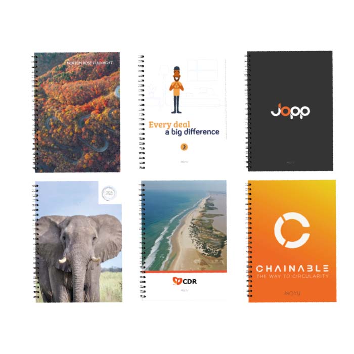 De særlige notesbøger fra MOYU er naturligvis perfekte som bæredygtig gave til dine medarbejdere, kunder eller samarbejdspartnere. Derfor kan de fuldt ud personaliseres med dit eget design. Med en MOYU-notesbog som gave fortæller du en bæredygtig historie, skaber positiv impact og giver dine relationer en praktisk, flot gave.