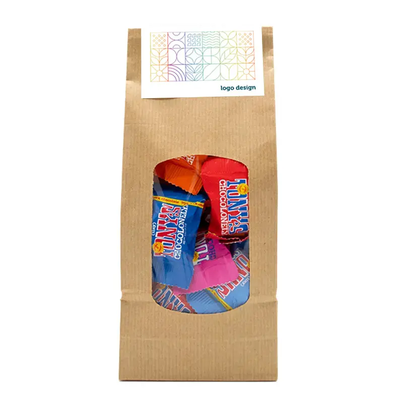 Hvor sjovt er det ikke at give en pose med hele 25 Tiny Tony's i forskellige smagsvarianter? Kraftposen lukkes med et kort, som kan trykkes i fuld farve med dit logo eller eget design.