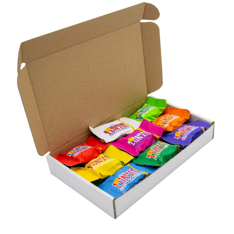 Denne postkassevenlige æske er fyldt med 18 lækre mini-chokolader fra Tony's Chocolonely. På æsken kan du få trykt dit eget design eller logo i fuld farve.
