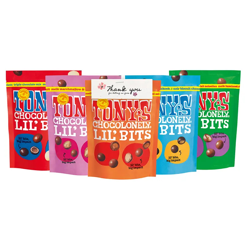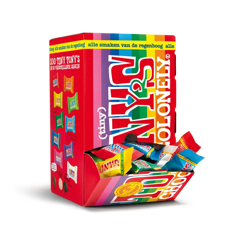 Mini Tony's chokolader er også et hit. De er pakket enkeltvis og leveres i en æske med 100 stk. Æsken fås i tre varianter: mørk, mælkechokolade og en mix af smage. Hver Tiny Tony kan forsynes med en fuldfarvet sticker med logo.