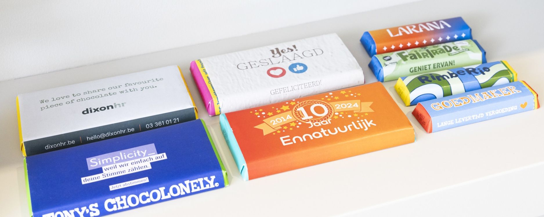 Denne lækre, store chokoladebar fås i 11 smagsvarianter. Det er også muligt at vælge en blanding af forskellige smage. Du kan gøre baren ekstra speciel med din egen wrapper (almindeligt papir eller frøpapir). Wrapperen kan du designe helt selv og den trykkes i fuld farve.