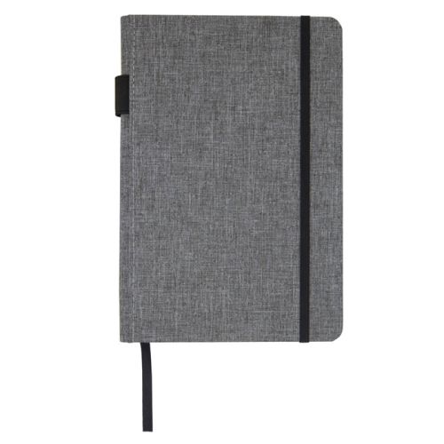 Denne notesbog har et stofomslag af genanvendt plast. Indeni finder du 96 ark genanvendt papir med linjer. Derudover er notesbogen udstyret med en elastisk lukning, et bogmærkebånd og en penløkke. Superpraktisk! Du kan få forsiden trykt i 1-4 farver med dit logo eller din tekst.