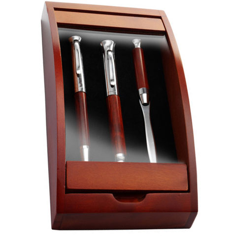 Det er nemt at imponere dine relationer med en luksuriøs gave som dette smukke pennesæt. Penneholderne er fremstillet af rosentræ og har elegante metaldetaljer. Sættet består af en kuglepen med sort blæk og en stiftblyant samt en brevåbner. De tre dele leveres samlet i en luksuriøs æske af birketræ med transparent låg.