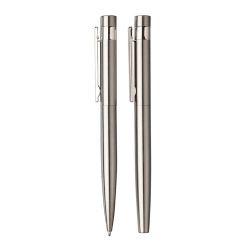 In diesem stilvollen Schreibset aus recyceltem Edelstahl befinden sich ein Drehkugelschreiber und ein Tintenroller. Beide Stifte schreiben mit blauer Tinte und tragen ein dezentes Logo auf der Rückseite. Die Verpackung aus Kraftpapier rundet das Set perfekt ab. Ein nachhaltiges Geschenk, das man nicht einfach zur Seite legt. Ideal, um Ihre Marke langfristig bei Kunden oder Geschäftspartnern sichtbar zu machen.