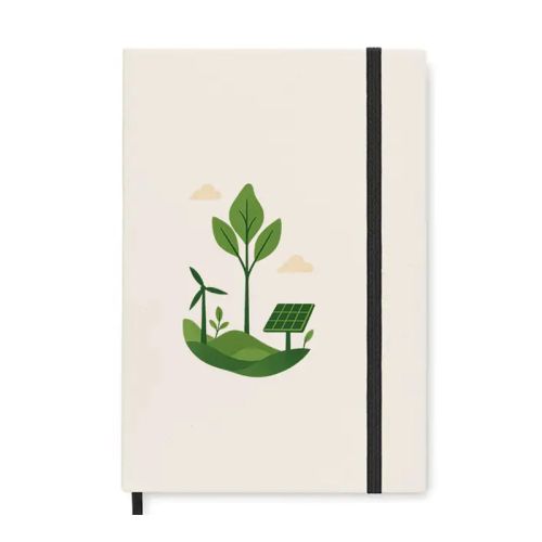Denne A6 notesbog er for størstedelens vedkommende fremstillet af genanvendte mælkekartoner (70%) – et flot eksempel på cirkulær anvendelse! Den resterende del er lavet af genanvendt papir. Notesbogen har en praktisk spiralbinding og elastisk lukning. Der medfølger også en pen med blå blæk inkl. holder.