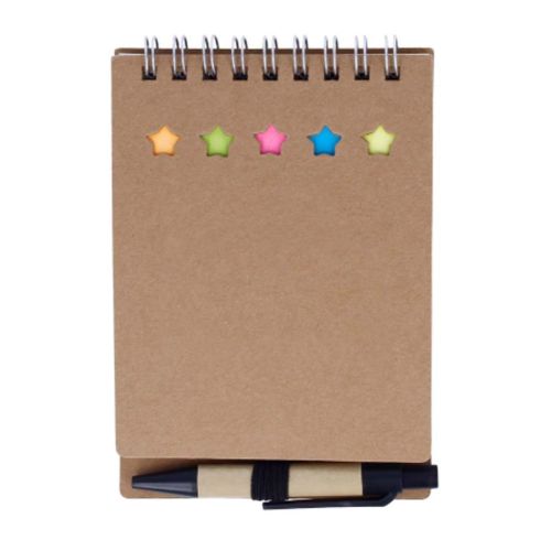 Denne genanvendte notesbog har 5 farvede faner, som er synlige fra toppen via udstansede stjerner. Det giver en rigtig flot effekt! Notesbogen har to lag med en memoblok paa 20 ark, og naar du vender laget, finder du yderligere 40 sider med linjeret papir. Den sortskrivende kuglepen i elastikken fuldender saettet. Kuglepennen er fremstillet af karton, hvilket understotter det baeredygtige valg.