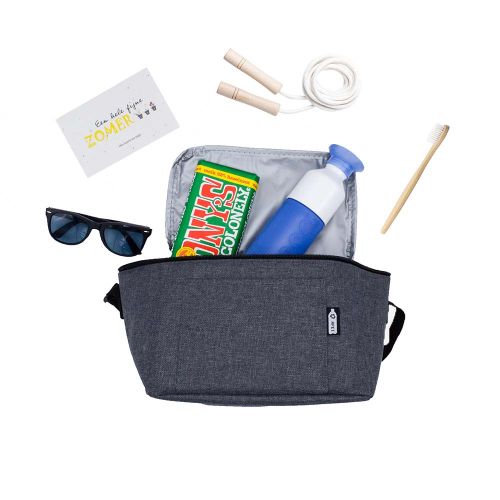 Med denne stilfulde køletaske som sommergave gør du helt sikkert indtryk! Tasken er fremstillet af genanvendt plast og har en isoleret inderside. Det ekstra smarte er, at du selv kan sammensætte indholdet i tasken med produkter fra vores sortiment. For eksempel solbriller, fairtrade chokolade eller en genanvendelig drikkeflaske. Kontakt os for mulighederne og et tilbud.