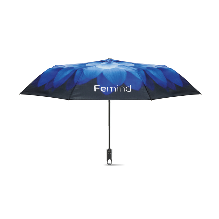 Med en sammenklappelig RPET-paraply vælger du en praktisk løsning. Denne paraply er nem at tage med overalt. Lad dit brand skinne med all-over tryk på ydersiden. Også indersiden af paraplyen samt det tilhørende etui kan trykkes. Derudover kan du vælge et håndtag i bambus og et automatisk åbnings- og lukkesystem.