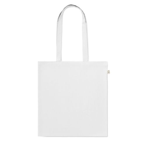 Vil du gerne bidrage til et bedre miljø? Vælg en bæredygtig bomuldspose som firmagave! Tasken består af 70% genanvendt bomuld og 30% genanvendt PET. Drop plastikposerne – det slidstærke materiale (140 g/m²) sikrer, at tasken holder længe og kan genbruges igen og igen. Med de lange håndtag kan du nemt bære tasken over skulderen, hvilket gør den ideel til daglig brug.