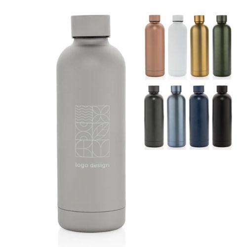 Vil du give en stilren flaske i gave til medarbejdere, kunder eller relationer? Så er denne termoflaske det perfekte valg. Flasken er fremstillet af genanvendt rustfrit stål og fås i hele ni farver. Den har en kapacitet på 500 ml. Du kan få flasken lasergraveret med dit logo eller tekst – det fuldender naturligvis det samlede udtryk!