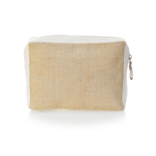 Denne toilettaske er fremstillet af to smukke naturmaterialer, nemlig jute og bomuld. Overrask dine relationer eller kunder med denne elegante toilettaske. Perfekt både til rejser og til brug derhjemme. Toilettasken har et format på 20 x 15 x 6 cm. Dit logo eller din tekst kan trykkes på forsiden i én farve.